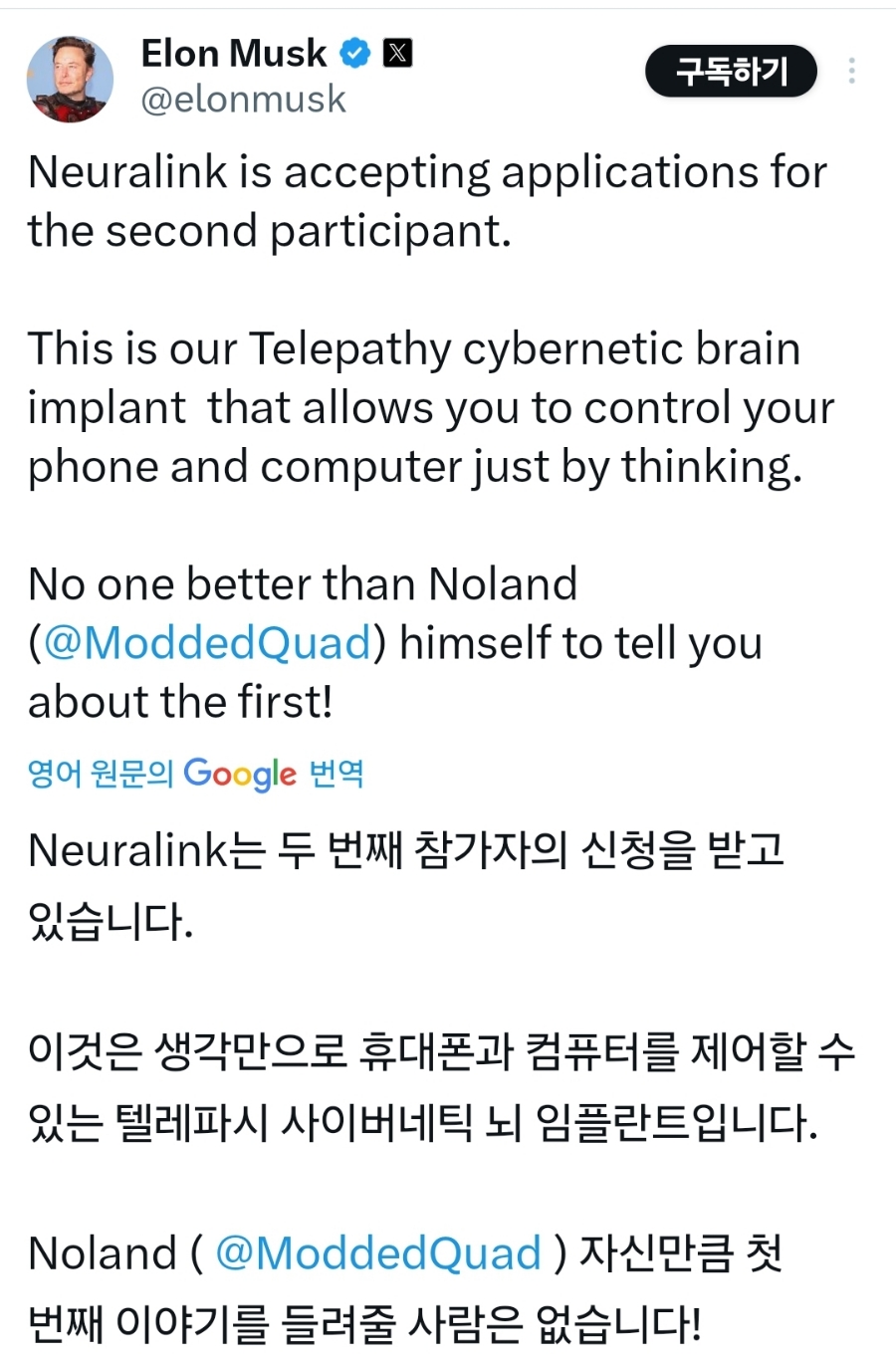테슬라의 또 다른 사업인 뉴럴링크의 기술 개발도 진전을 보이고 있는 듯합니다.