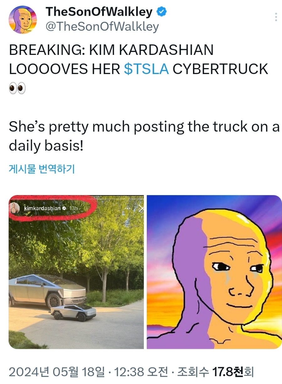 킴 카다시안도 마찬가지입니다. SNS를 통해 사이버트럭이 담긴 일상 모습을 많이 노출시키고 있는데요... 테슬라 입장에서는 무료 광고 효과가 극대화되고 있어서 긍정적이라 봅니다. 사이버트럭 옆에 작은 꼬마(?) 사이버트럭이