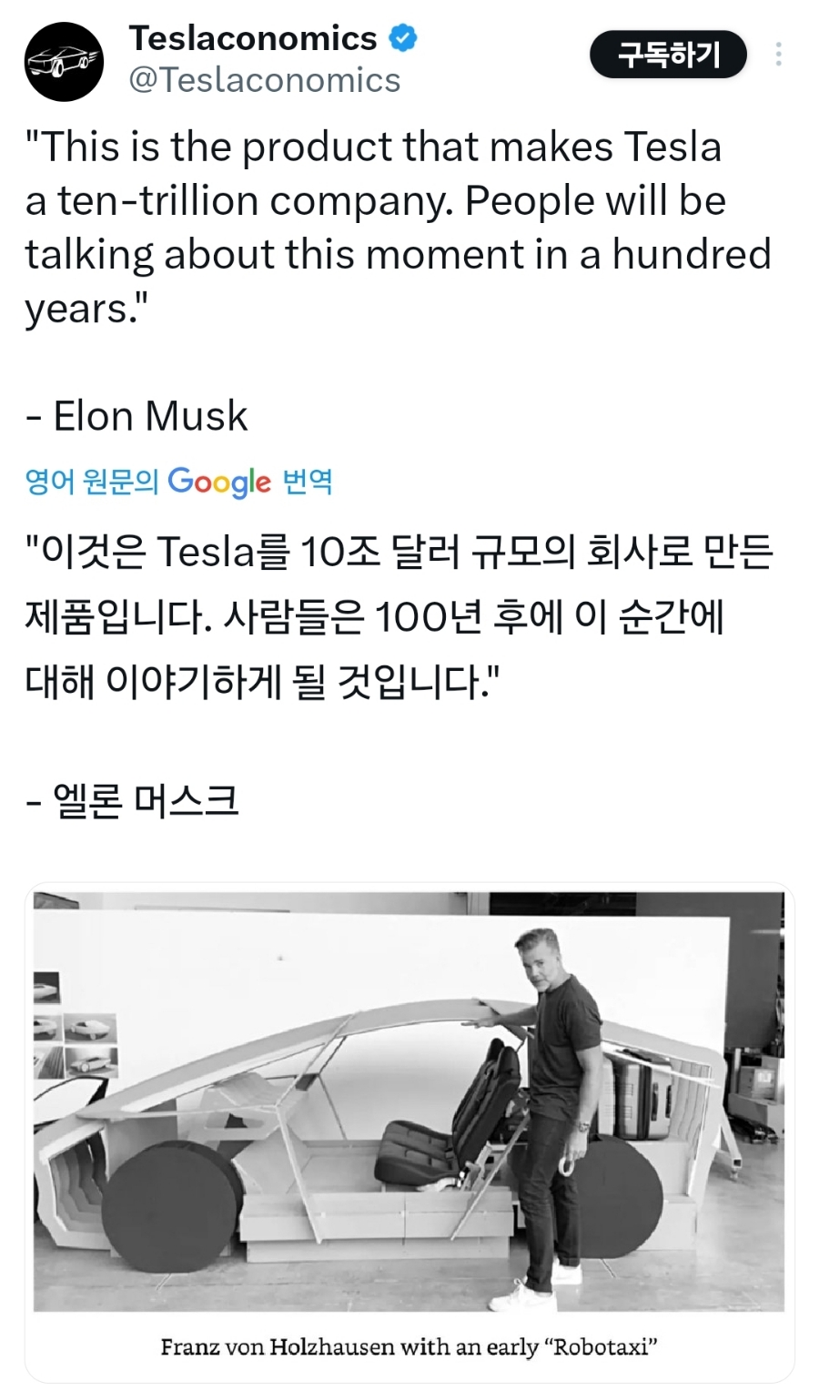 로보택시가 테슬라를 10조 달러 규모의 회사로 성장할 수 있도록 이끄는 제품이 되기를 저도 기대해 봅니다. 테슬라 전기차 및 FSD 사업의 성공적 도약을 지켜보겠습니다^^