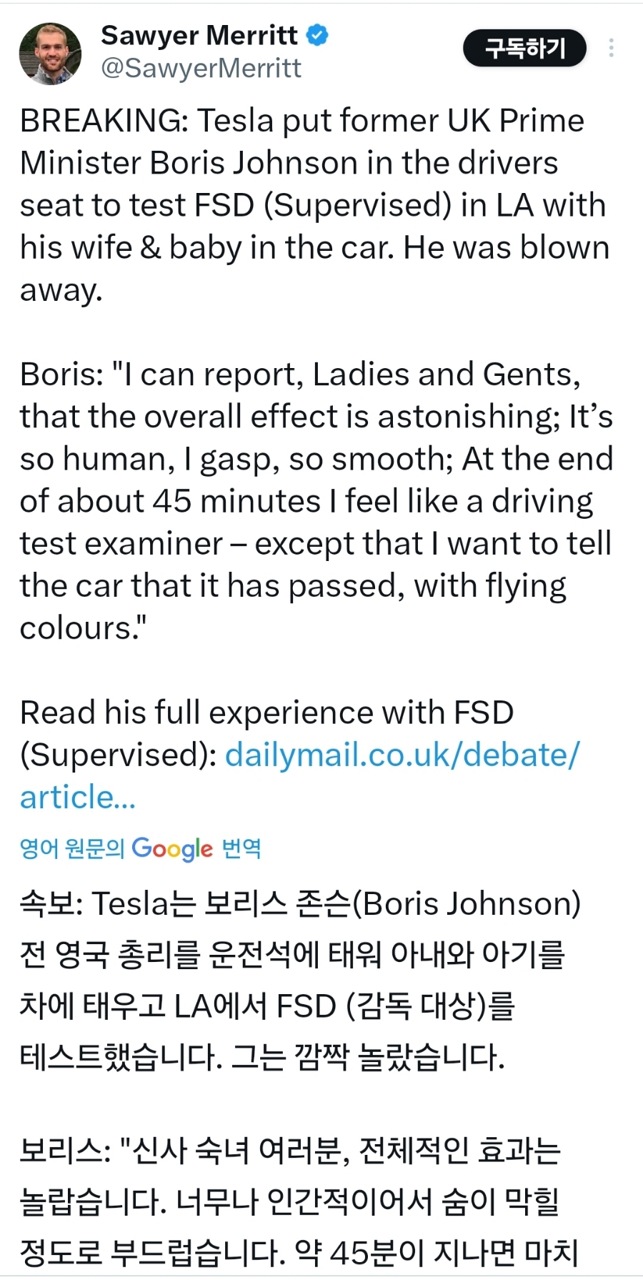 영국의 보리스 전 총리가 테슬라 FSD를 테스트한 소식이 올라와 있네요...