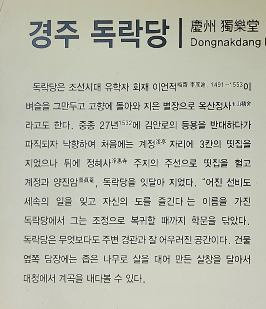 조선시대 유학자 이언적이 벼슬을 그만두고 고향에 돌아와 지은 별장이라고 하네요...