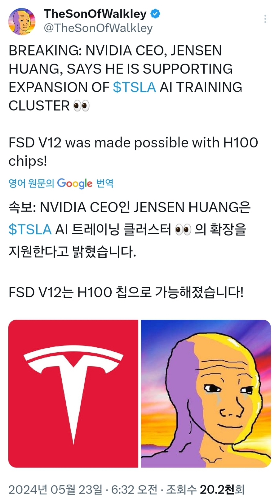 엔비디아 CEO 젠슨 황이 테슬라 AI 트레이닝 클러스터의 확장을 지원하다고 언급을 했다고 하네요.