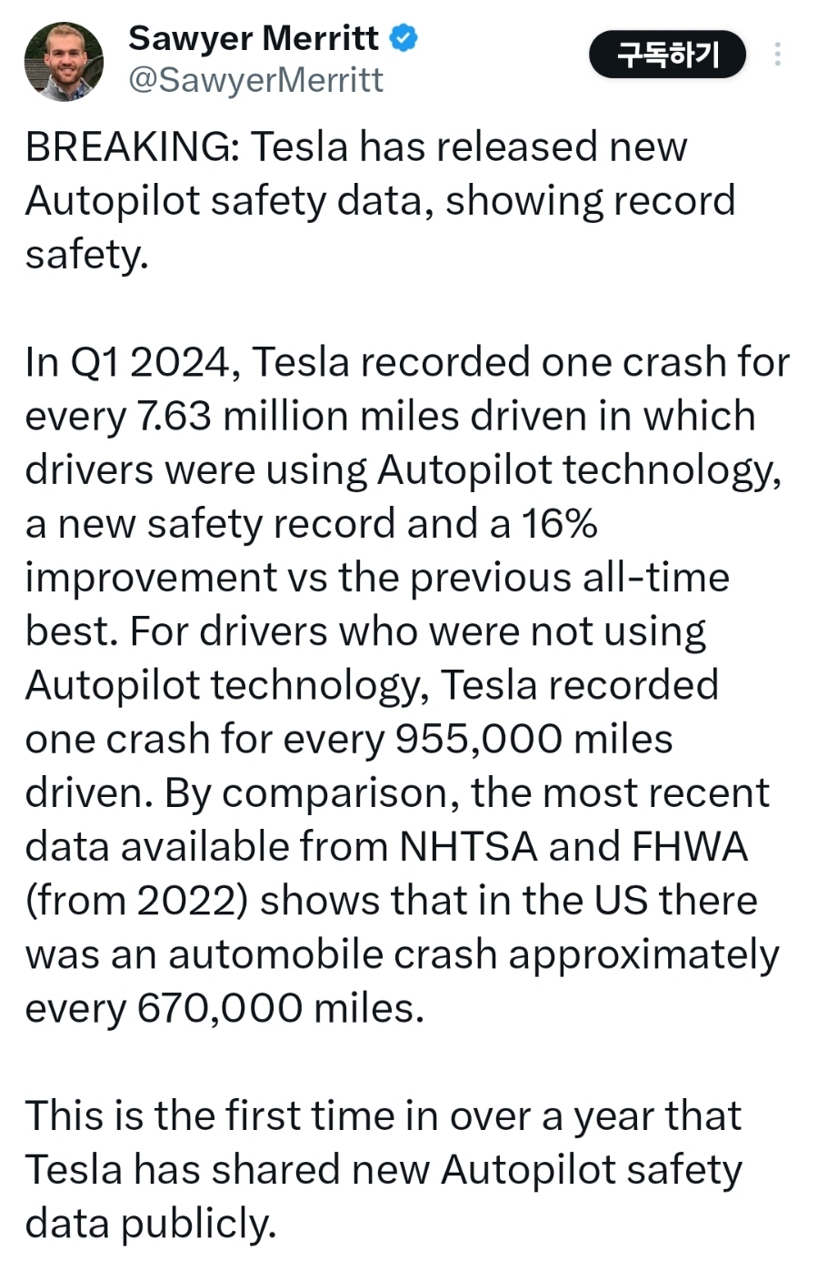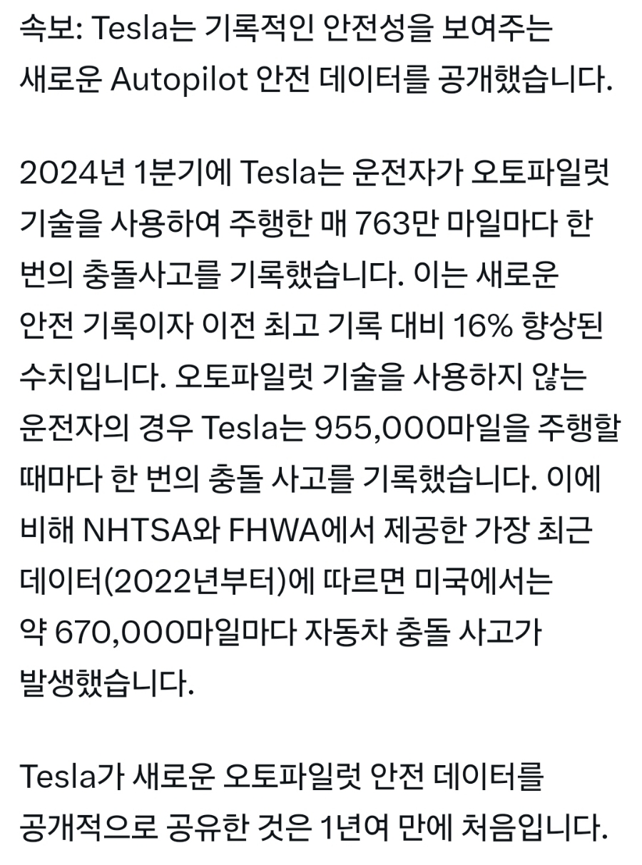 2024년 1분기에 테슬라 오토파일럿을 사용한 운전자는 7,630,000마일마다 한 번의 충돌 사고를 기록했다고 합니다.