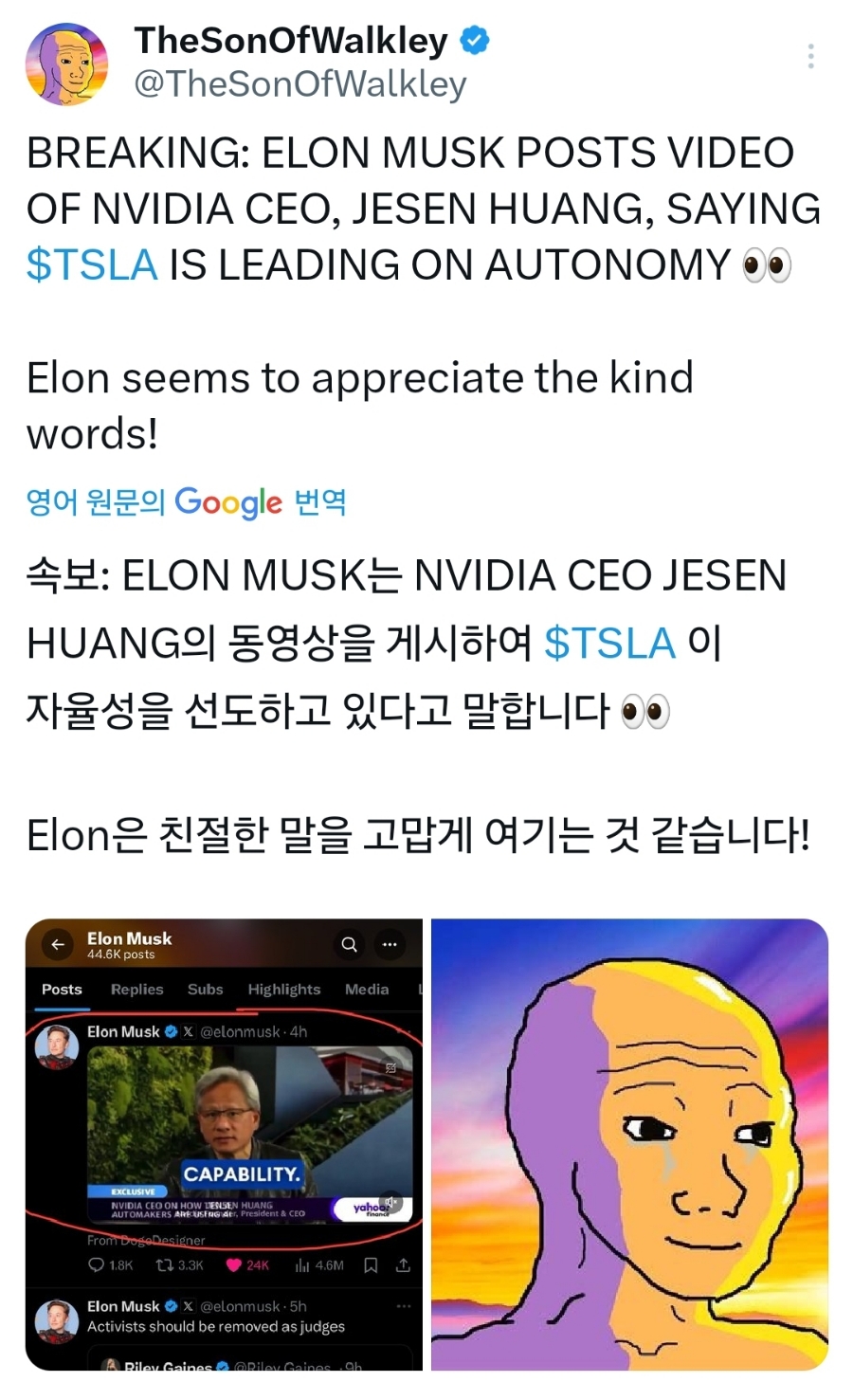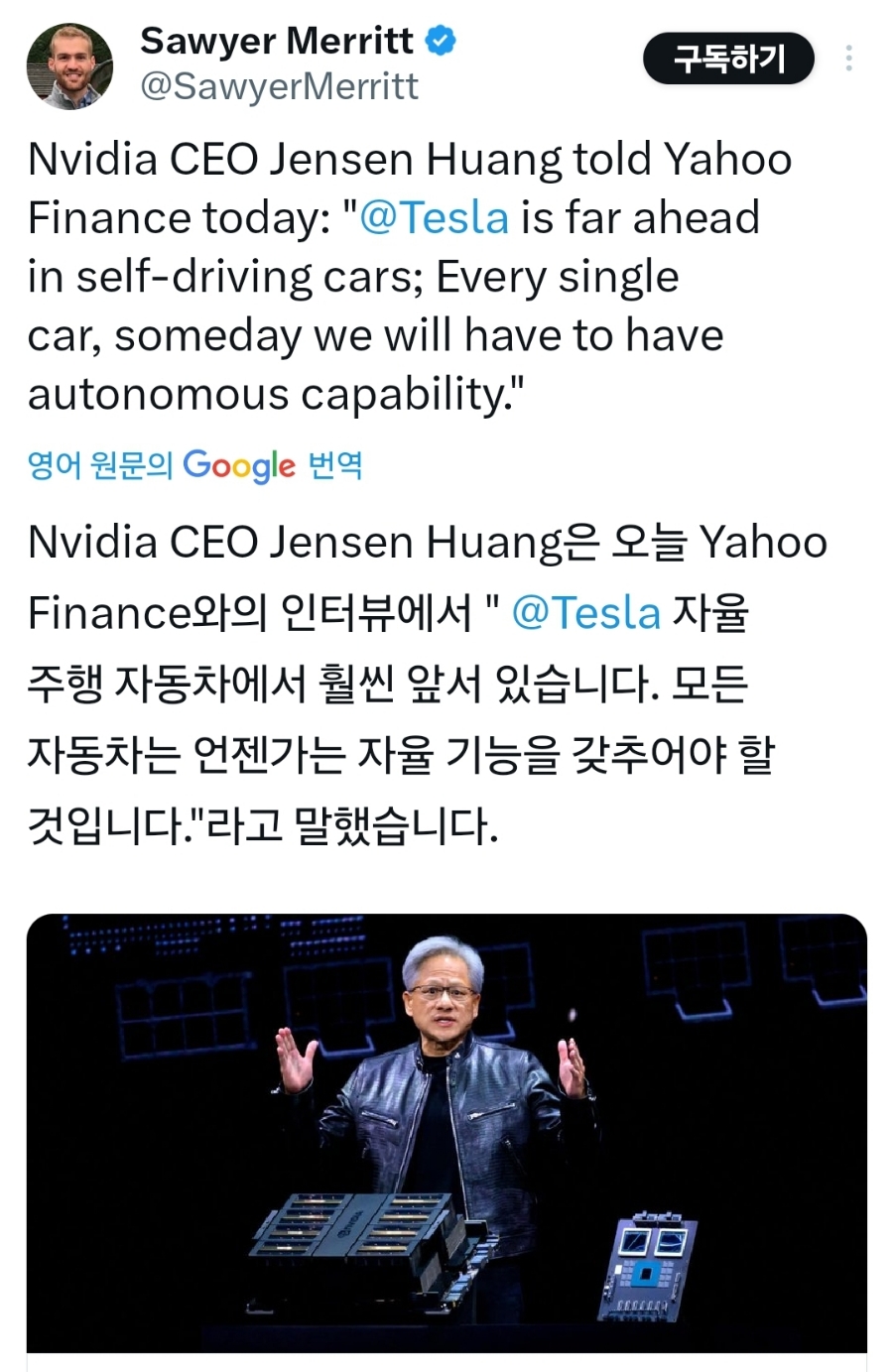 이런 젠슨 황 엔디비아 CEO의 인터뷰에 일론 머스크가 감사의 멘트를 남겼습니다.