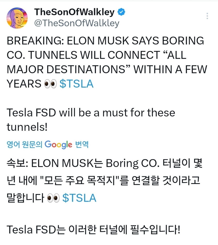 FSD 기술과 보링 컴퍼니의 지하 터널이 연동된다면.... 엄청난 시너지가 나올듯합니다.