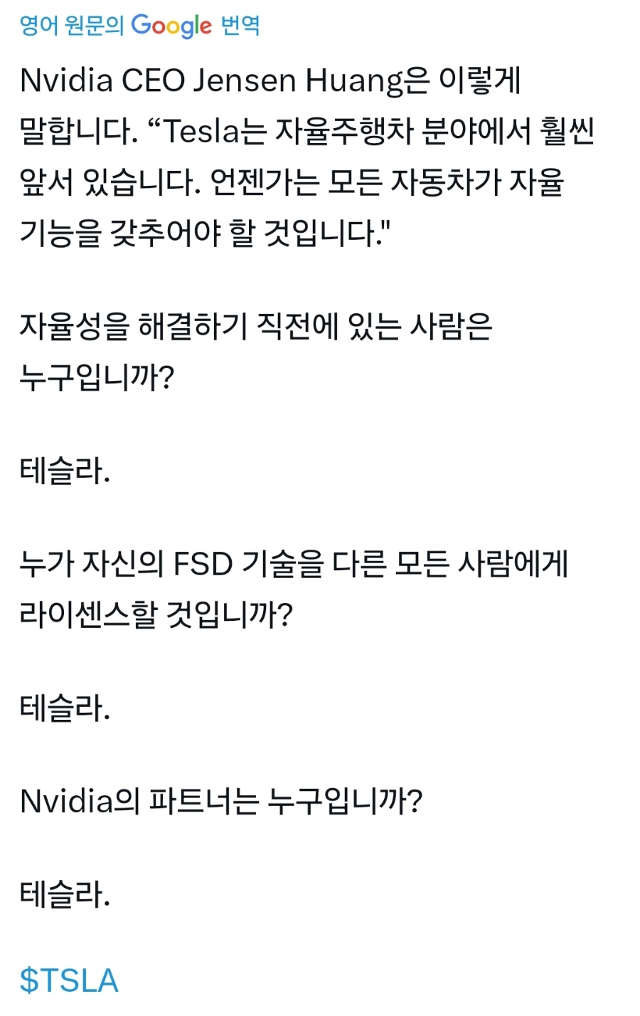 어제 포스팅에 이어 오늘도 엔비디아 젠슨 황 CEO의 테슬라 자율주행에 대한 긍정적 멘트를 가져왔습니다. 엔비디아의 파트너는 TESLA라는 말이 아주 의미심장합니다.