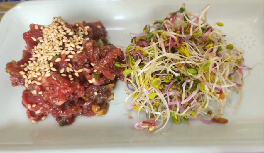 한우육회입니다. 제가 육회를 잘 즐기진 않지만 이번에는 하나도 남기지 않고 싹 다 먹었습니다. 흔히 맛볼 수 있는 단맛 강한 육회가 아니라 신선한 고기의 맛을 입안에서 끝까지 음미할 수 있어서 참 좋았습니다.