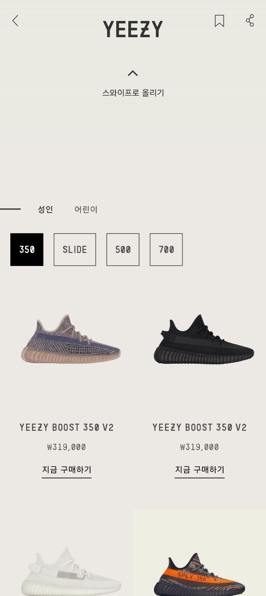 아디다스 confirmed 앱에 들어가면 이지 YEEZY 제품군 350, SLIDE, 500, 700이 판매가 되고 있습니다. 저는 350 군을 중점적으로 살펴보았는데요