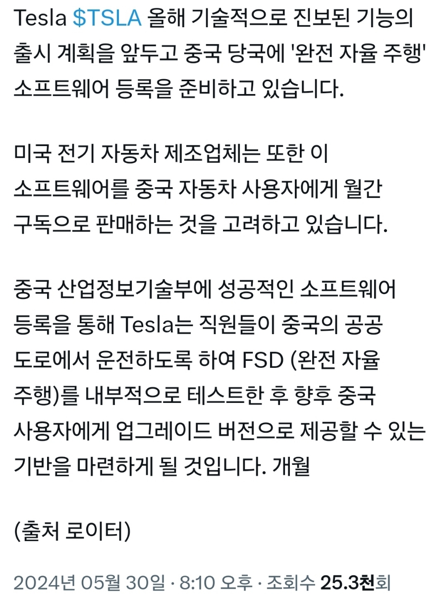 중국 내에서의 FSD 구독 형식의 배포가 더욱 기대가 됩니다!!