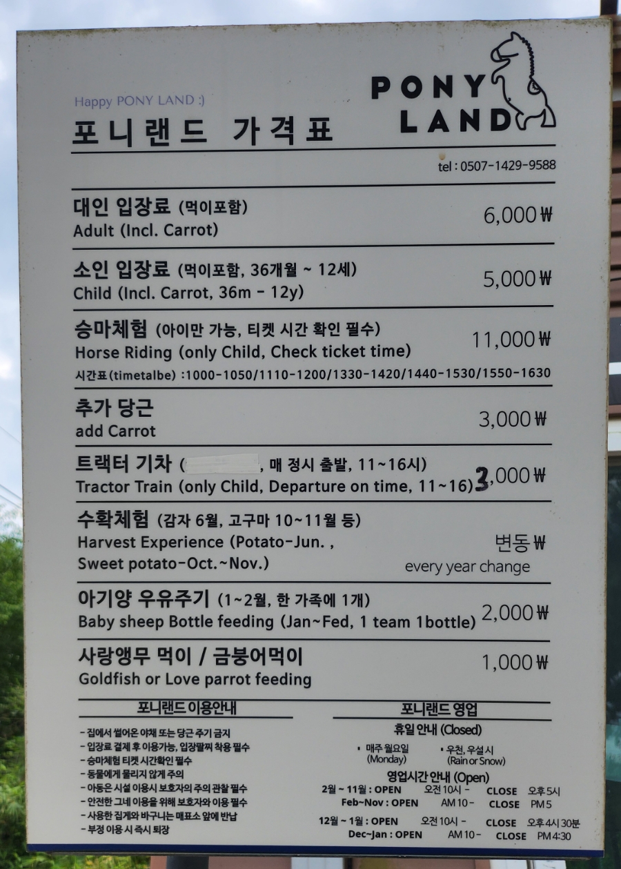 포니랜드의 가격표는 다음과 같습니다.