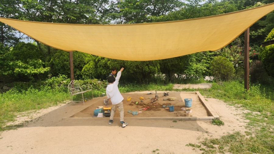 위로 더 올라가서 잔디밭을 지나면 이런 모래 놀이터도 나왔습니다.