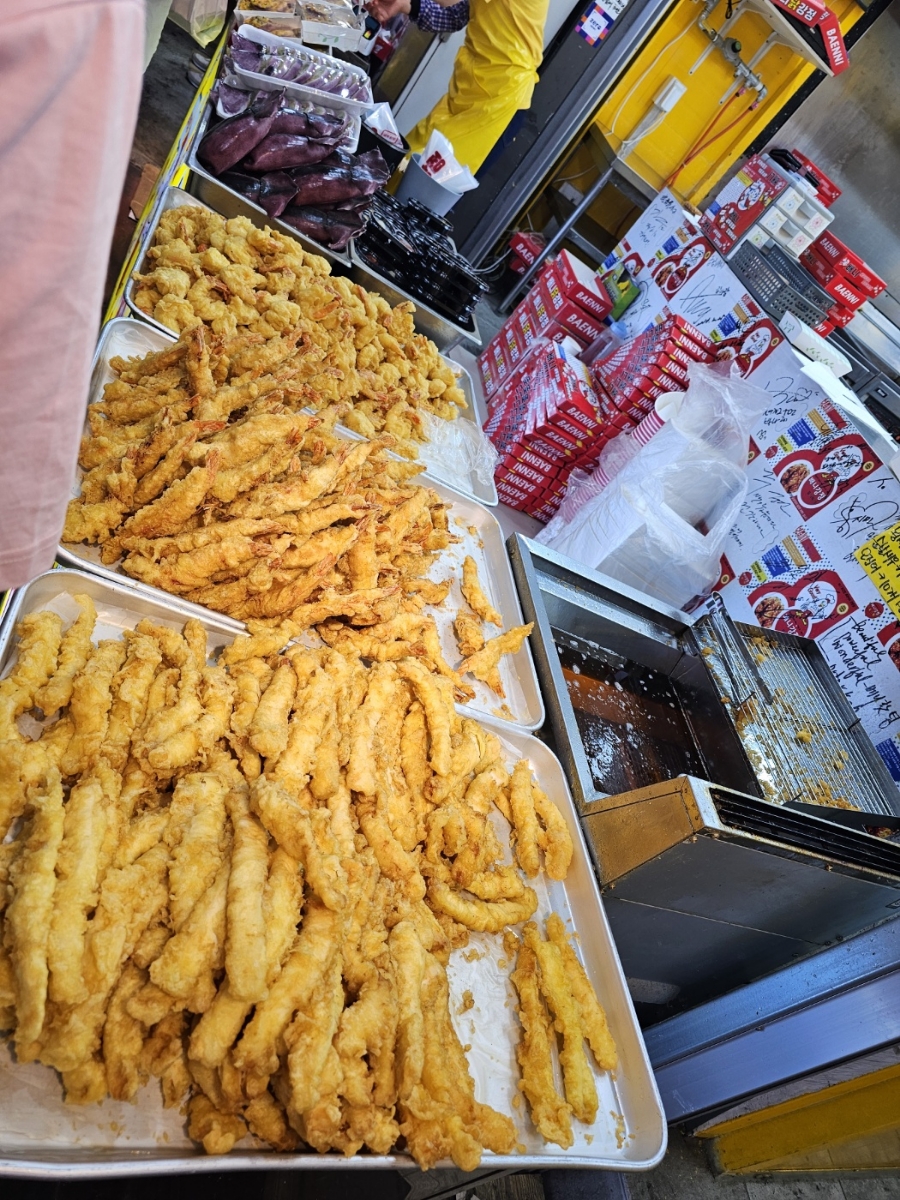 강릉 중앙시장의 최고 인기 메뉴인 닭강정과 새우튀김, 오징어튀김을 맛보았습니다.
