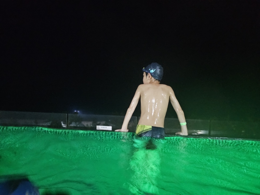 저녁시간에 해가 지고나서 조명 가득한 풀 속에서 아이들이 즐겁게 수영을 하였답니다.