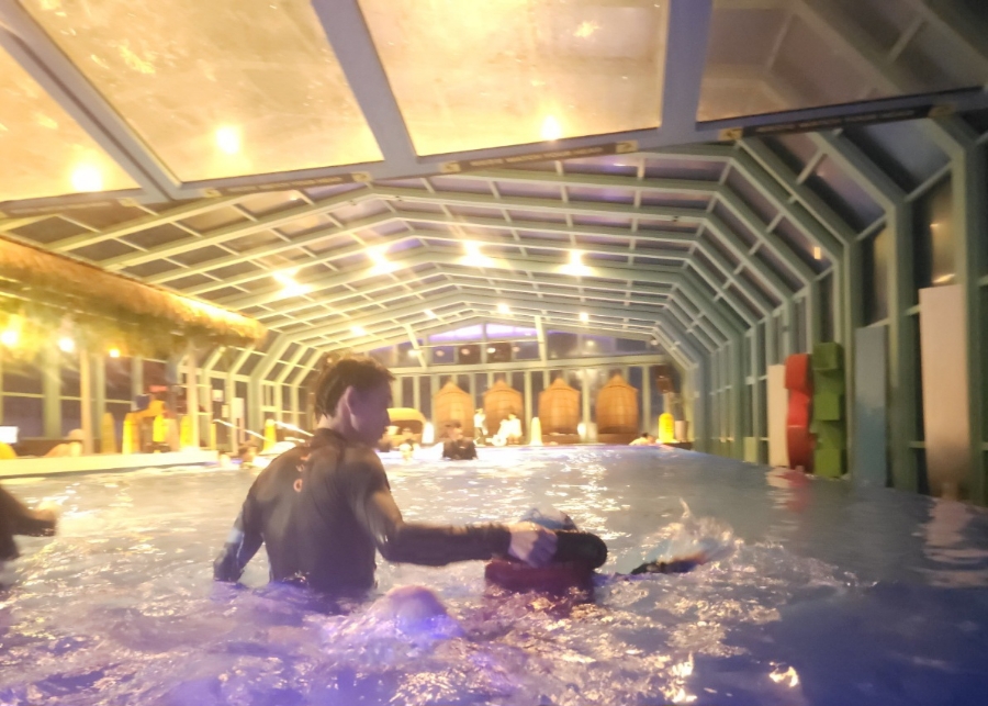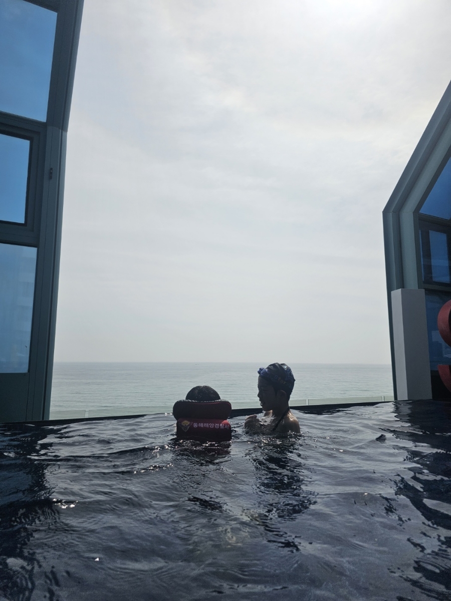 둘째 날 오후, 숙소로 돌아와서 드디어 강릉 세인트존스 호텔 내 파인 풀에서 물놀이를 했습니다.