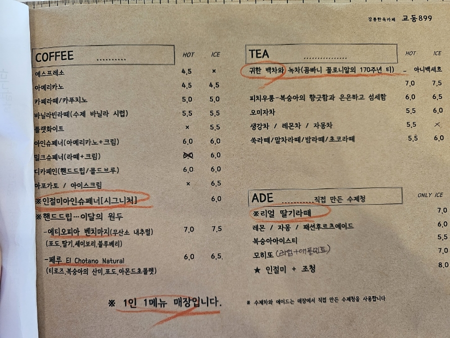 메뉴판을 살펴보다가 저희는 시그니처 메뉴인 인절미아인슈페너 한 잔을 주문하였고