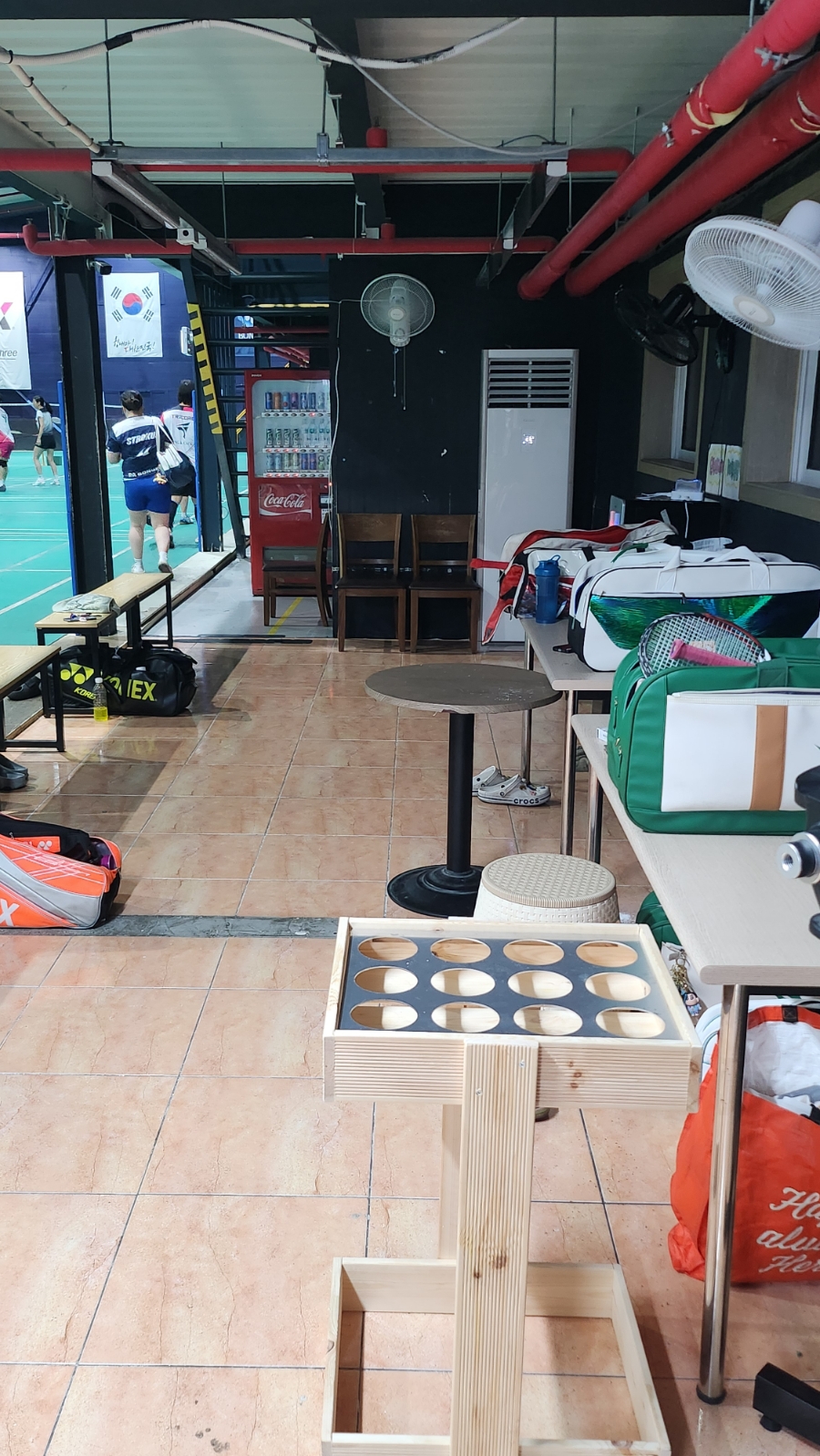 커다란 배드민턴 가방과 음료를 거치할 수 있는 공간, 의자와 테이블이 넉넉하게 마련되어 있습니다.