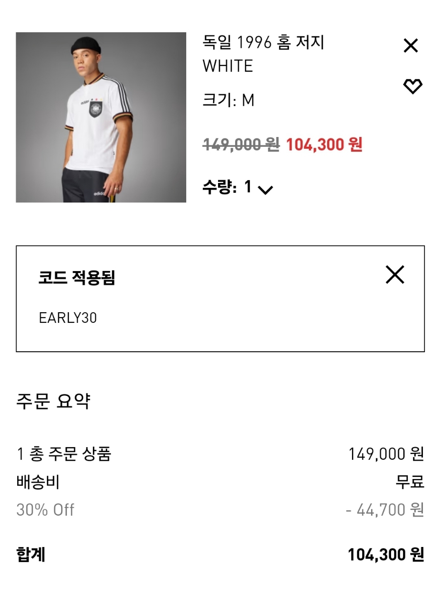 현재 아디다스 홈페이지에서 "EARLY30" 코드를 바로 적용하면 30% 즉시 할인이 되네요