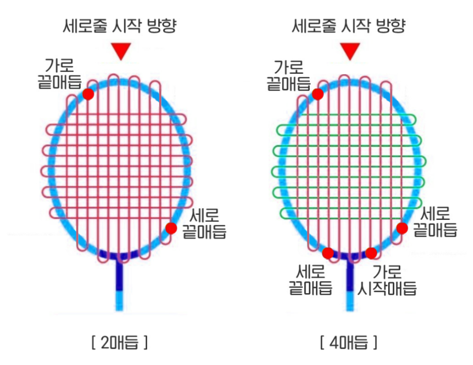첫 번째, 2매듭은 매듭 묶음이 2군데로 라켓에 셔틀콕이 맞거나, 라켓끼리 부딪쳤을 때, 코트 바닥에 쳤을 때 충격이 매듭 2군데로 힘이(충격)가 기 때문에 라켓에 무리가 많이 감.(매듭짓는 부분에 충격이 감) 반면, 4매듭은 매듭 묶음이 4군데로 충격이나 가해진 힘이 분산되기 때문에 부러짐이나 안정성 확보, 라켓 수명에 좋음.