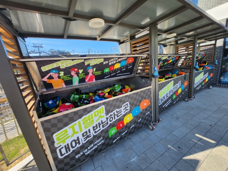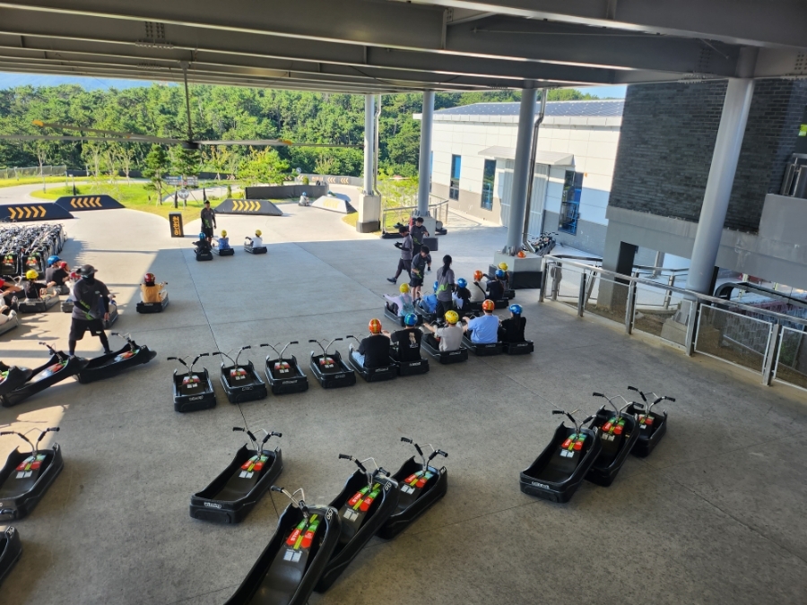 오른쪽에서는 루지 조작 교육 및 안전교육을 실시 후 타고 내려갈 수 있어요