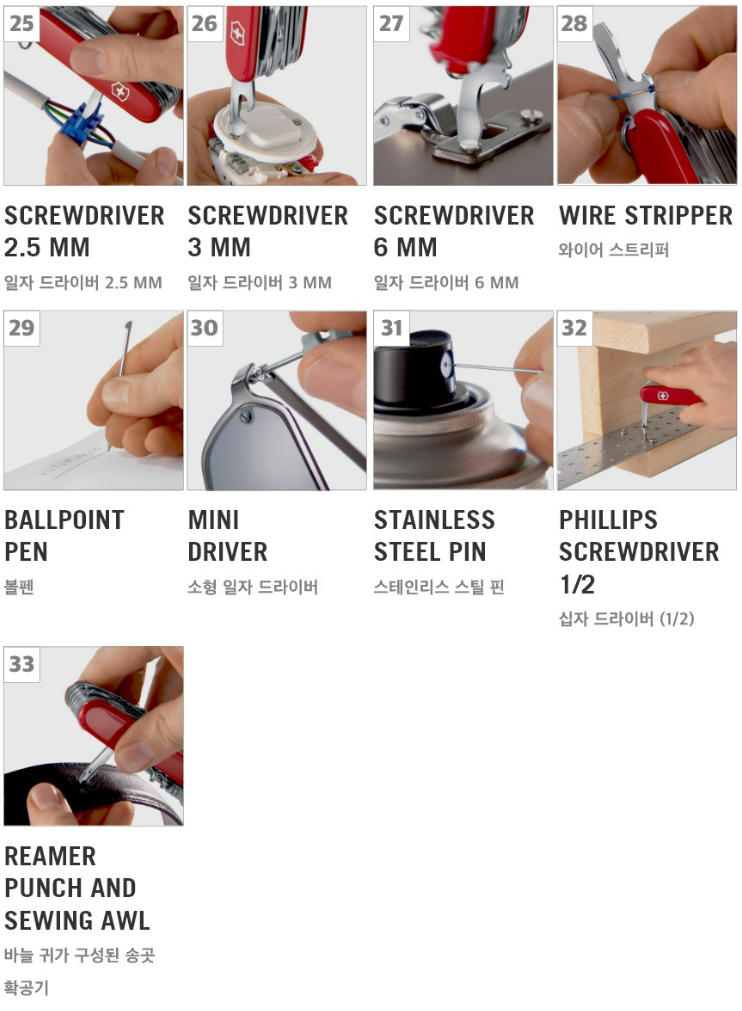 33가지 공구 어느 하나 기능을 수행하기 부족한 부분이 전혀 없다는 것이 스위스 메이드의 기술력 아닐까요?