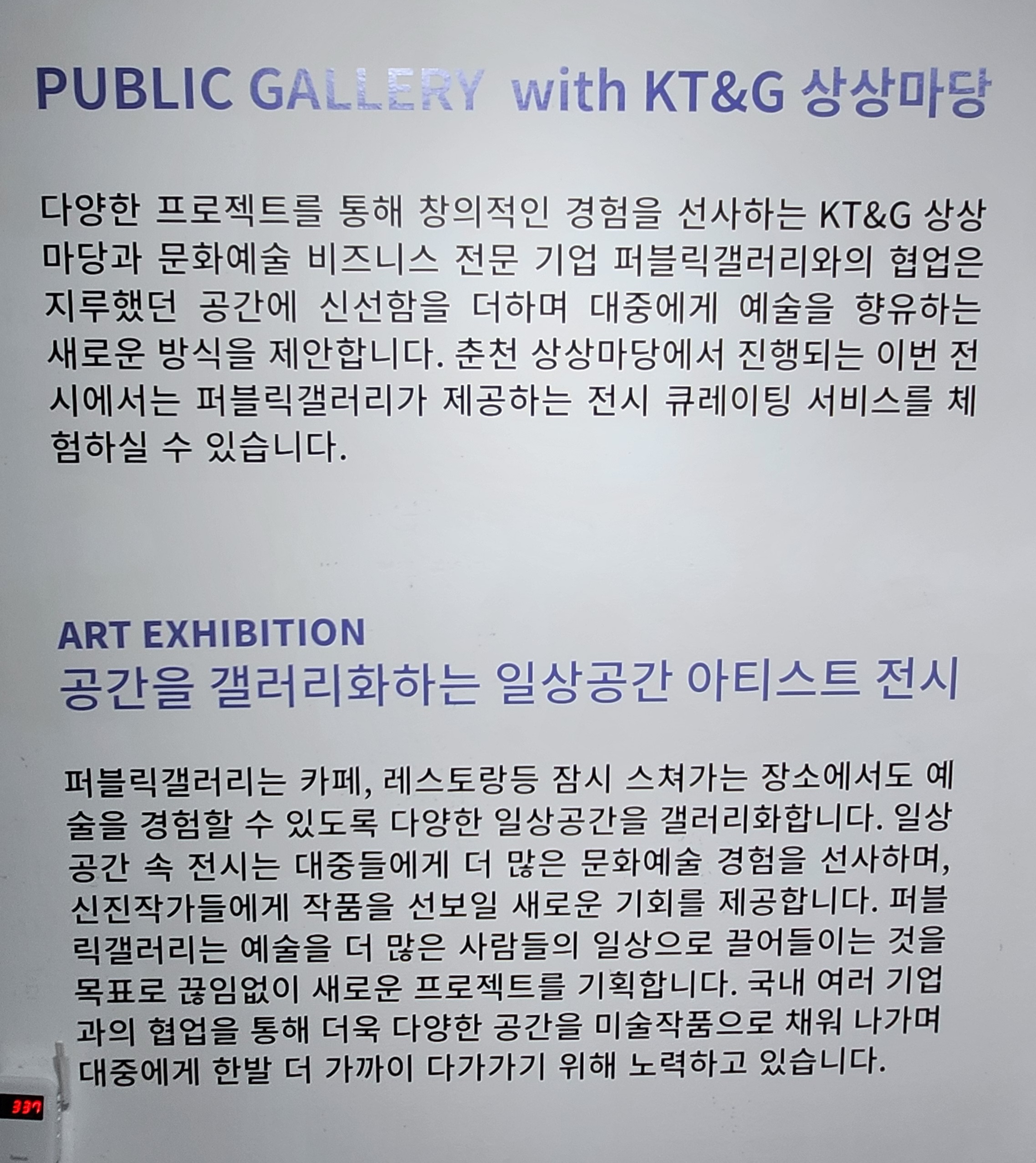 지난주에 강원도 춘천 여행을 가게 되었습니다. 우연히 묵게 된 KT&G 상상마당 추천스테이 호텔에서 전시회를 관람하게 되었는데요. 인상적이어서 포스팅해 봅니다^^