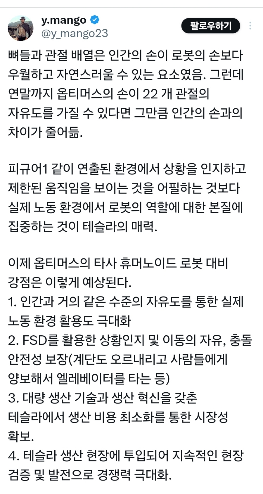 인간형 로봇 옵티머스의 발전이 가속화되는 듯합니다.