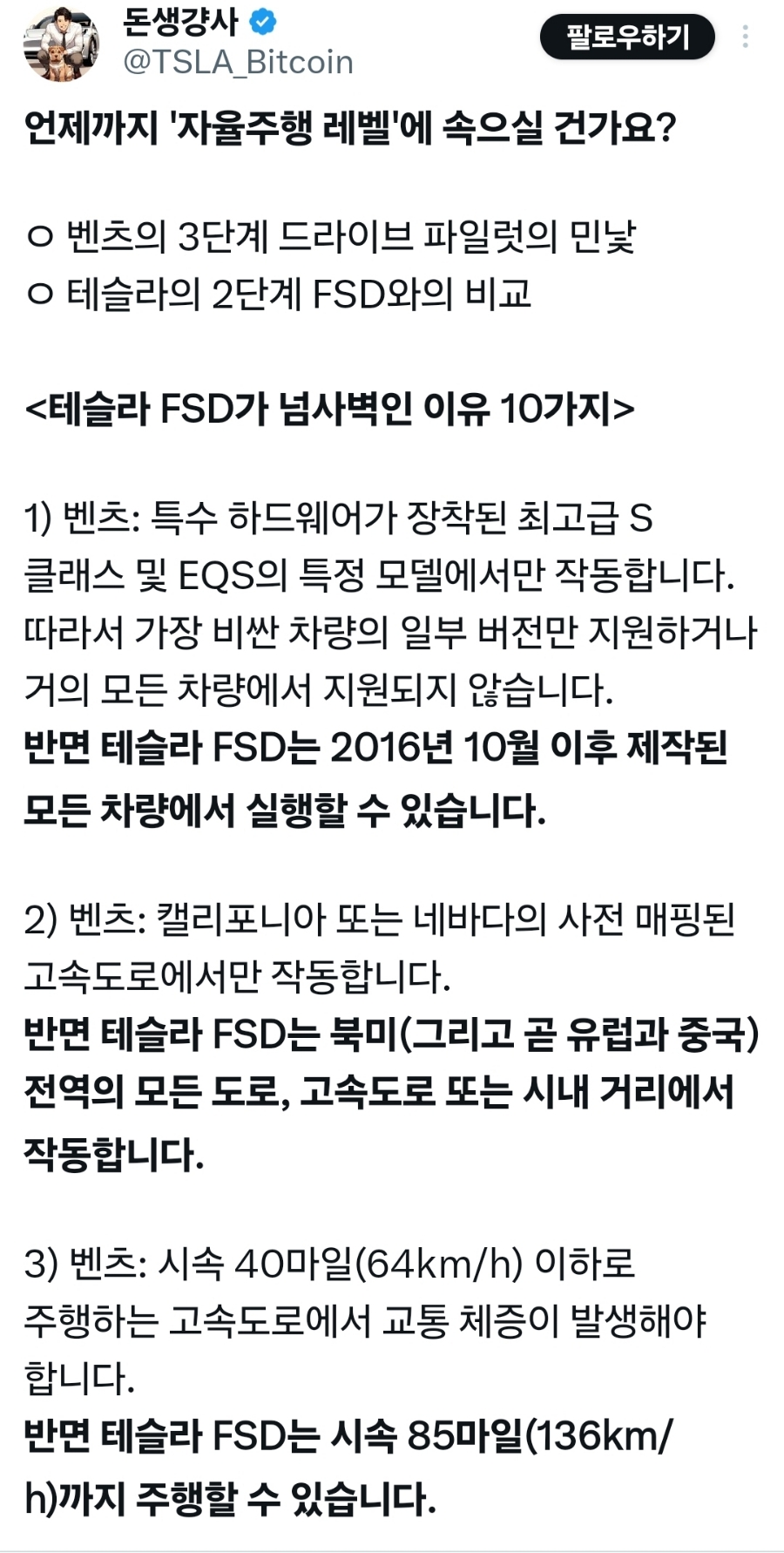 저도 벤츠가 자율주행이 테슬라 FSD를 앞선다는 이야기를 들은 적이 있는데요...