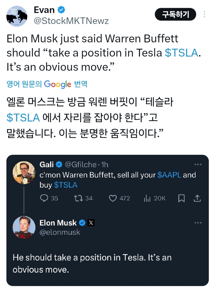 버크셔 주주총회에서 워렌 버핏이 테슬라에 대한 언급을 했었다고 포스팅을 했었는데요... 일론 머스크가 직접 X를 통해 워렌버핏의 테슬라에 투자에 대한 기대를 드러냈습니다. 최근 버크가 애플 비중 축소에 이어 BYD 비중까지 축소를 했다고 알려졌는데요...