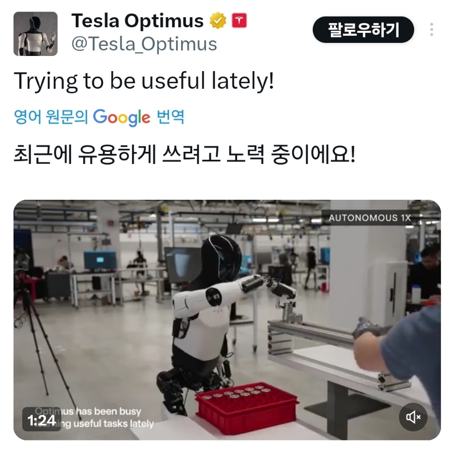 테슬라의 옵티머스는 공장에서 2기가 시험 운영 중이라고 하는데요... 현실 세계에서 유용하게 쓰이도록 업그레이드가 계속 진행되고 있는 듯합니다. 저 역시 가장 기대되는 부분이 FSD와 옵티머스인데... 테슬라는 주가와는 별개로 이 과업을 반드시 성공해낼 것이라고 생각합니다!!