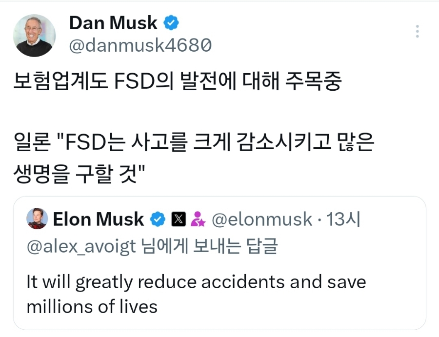 FSD가 교통사고율을 현저하게 낮추게 된다면... 현재 보험 시스템도 많은 변화가 생겨나지 않을까 싶네요...
