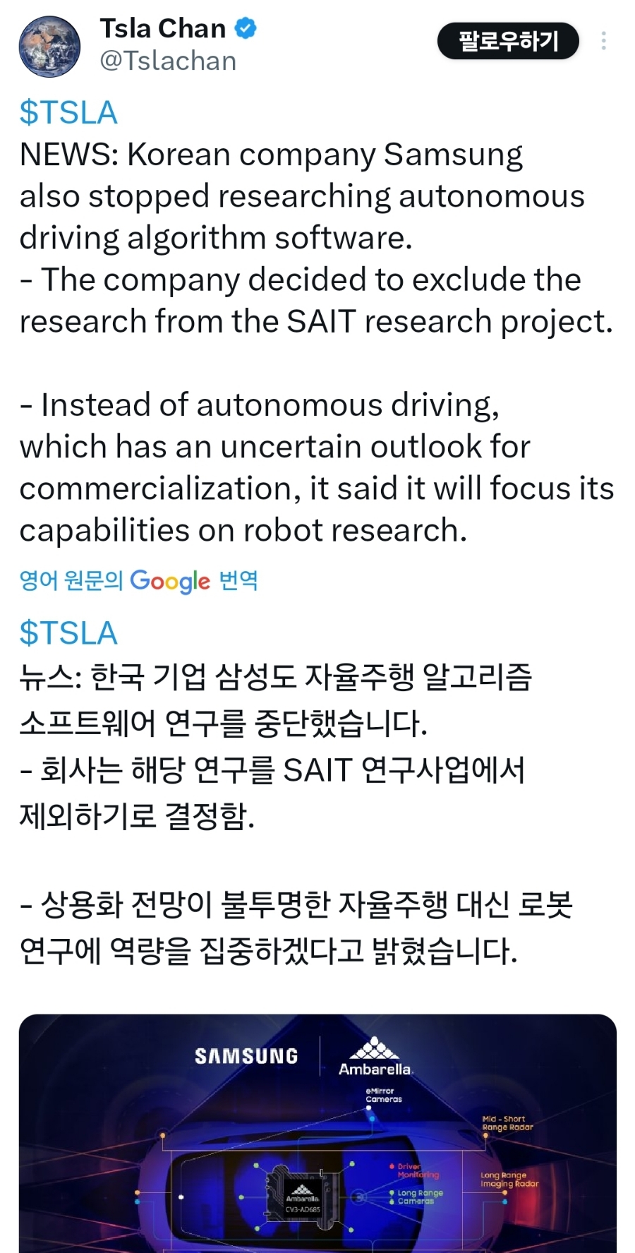 삼성도 자율주행 알고리즘 소프트웨어 연구를 중단했다고 합니다.