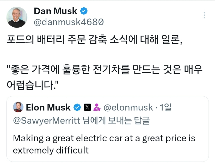 일론 머스크가 좋은 가격에 훌륭한 전기차를 만드는 것은 매우 어렵다고 트윗 했습니다. 전기차 시장에서 더욱 가격 경쟁력 있고, 더 많은 실제 수요를 만들어낼 수 있는 테슬라가 되었으면 합니다!!